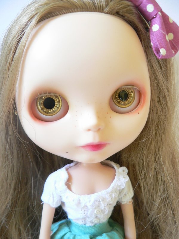 Since I bought Alice all ready customized, I wanted to "give" her something that will be from me, her new mommy. So I'v sent her to our frind natigil76 on flickr which is a custom artist genius. She and ilil actualy made Alice so pretty and perfect the first time. So since shes so perfect there's not much to do except she add a few beauty marks {or personality marks as she calls them :-)} and a new pair of custom handmade eye chips as seen in picture. And another bright yellow eye chips pair which I bought.